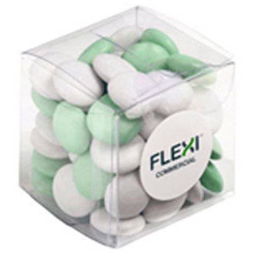 CUBE 60G CHOC BEANS (Mixed Colours). Branding: Full Colour Sticker, Product Size: 40mmW x 40mmH