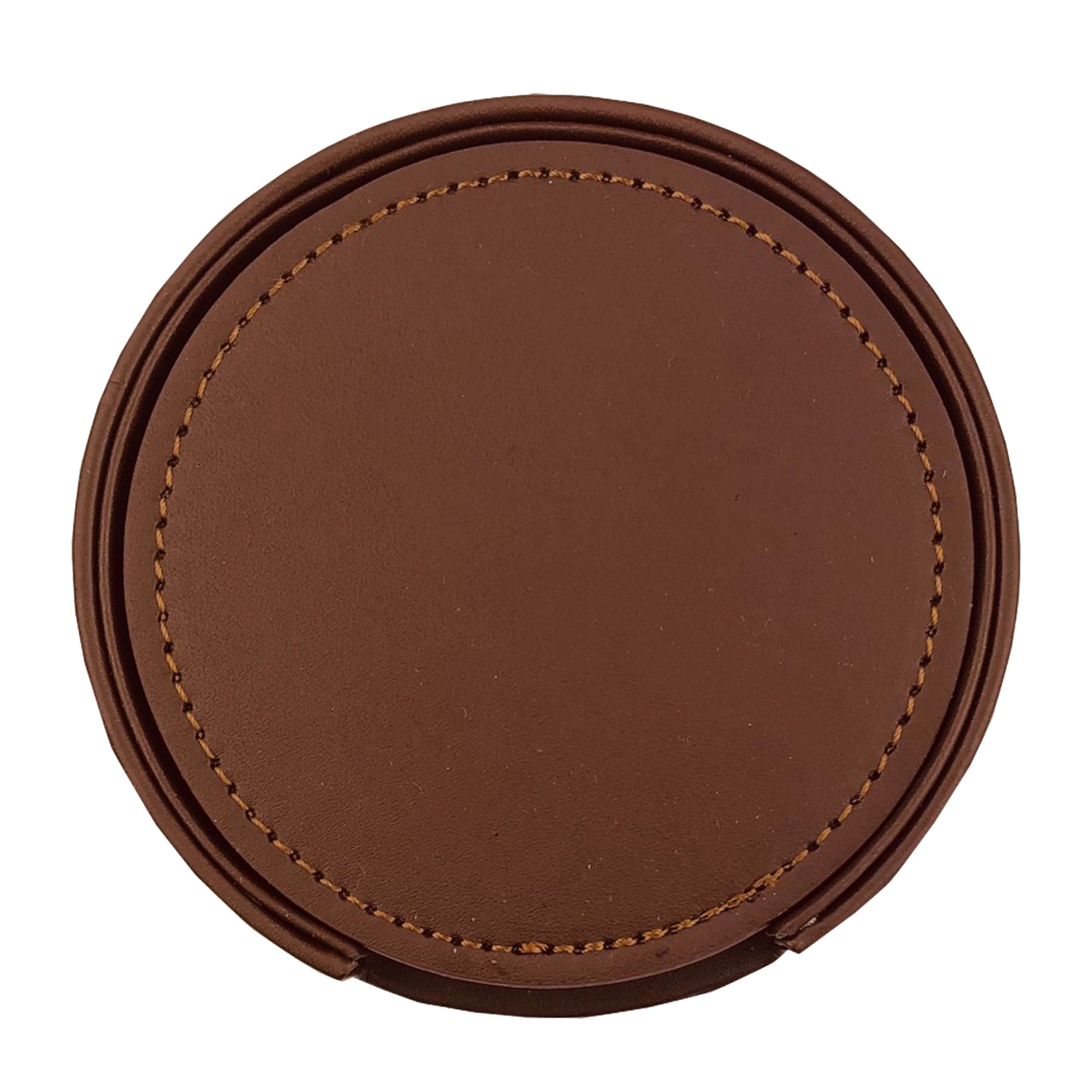 This high quality PU leather coaster set contains 6 pcs of coasters and a leather holder which keeps coasters neat and decorative. The set is presented in a black cardboard gift box. Size: 110mmD x 29mmH