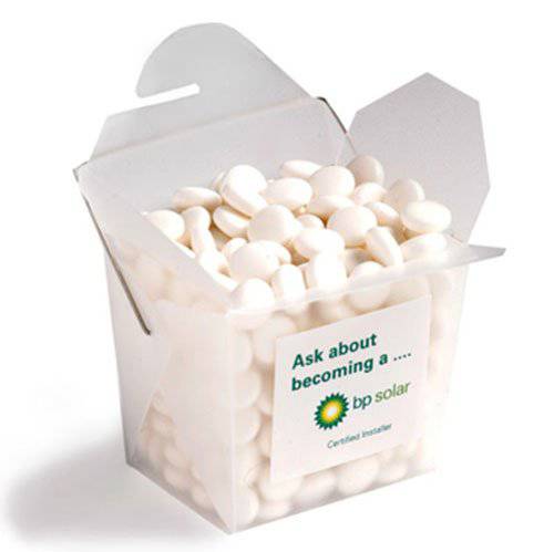 Frosted Noodle Box filled with Normal or Chewy Mints 100g. Branding: Branded Noodle Box with Sticker, Product Size: Base-62x46mm,Height-66mm,8oz